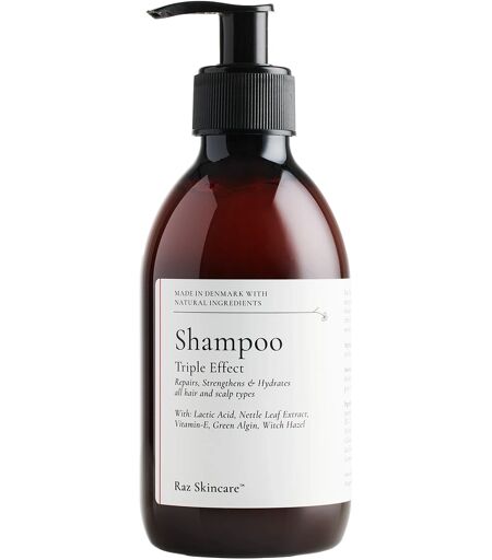 Raz Skincare Shampoo Triple Effect er en skånsom, men effektiv shampoo med et behageligt, cremet skum, der giver effektiv pleje til både hår og hovedbund. Takket være sammensætningen af frugt og plante-salte, grønne alger, troldhassel og brændenælde for bare at nævne nogle, hjælper denne formel med at genoprette fugtniveauet, styrke og reparere både hår og hovedbund. Troldhassel øger hårsækkenes produktion af keratin, som er det protein dit hår er dannet af. Det forlænger ligeledes hårets levetid og mindsker hårsækkens hviletid, samt hjælper mod en fedtet hovedbund og mod irritationer, som eksem, skæl og kløe i hovedbunden, ligesom det tilmed virker meget dybtrensende. Brændenældeekstrakt fra nældeurt understøtter hårets generelle sundhed og vækst, da det indeholder essentielle vitaminer og mineraler, der gavner hårets sundhed, herunder vitamin A, B, C, D og E, sammen med mineraler som folat, riboflavin, magnesium, kalium, calcium og jern. Denne cocktail af essentielle næringsstoffer bidrager til et sundt og glansfuldt hår. Fordele: Shampoo Velegnet til alle hårtyper Skånsom og effektiv pleje Med troldhassel- og brændenældeekstrakt Fugter, styrker og reparerer hår og hovedbund Modvirker fedtet hovedbund og irritation Vitaminer og mineraler bidrager til et sundt og glansfuldt hår Danner et behageligt, cremet skum Mild, krydret duft Anvendelse: Anvendes i vådt hår Massér blidt en passende mængde shampoo ind i hår og hovedbund i et par minutter Skyl grundigt med vand Gentag om nødvendigt hårvask Afslut evt. med RAZ Skincare Conditioner Triple Effect Ingrediensliste: Aqua, Glycerin, Polysorbate 20, Cocamidopropyl Betaine, Cocamidopropylamine Oxide, Glycereth-2 Cocoate, Sodium PCA, Xanthan Gum, Parfum, PEG-7 Glyceryl Cocoate, Lactic Acid, Sodium Chloride, Sodium Benzoate, Hydrolyzed Wheat Protein, Potassium Sorbate, Tocopherol, Benzyl Salicylate, Cellulose, Cellulose Gum, Hydrolyzed Algin, Linalool, Hamamelis Virginiana Leaf Extract, Hippophae Rhamnoides Fruit Extract, Urtica Dioica Leaf Extract, Coumarin, Maris Aqua, Citric Acid, Benzoic Acid, Chlorella Vulgaris Extract. ...