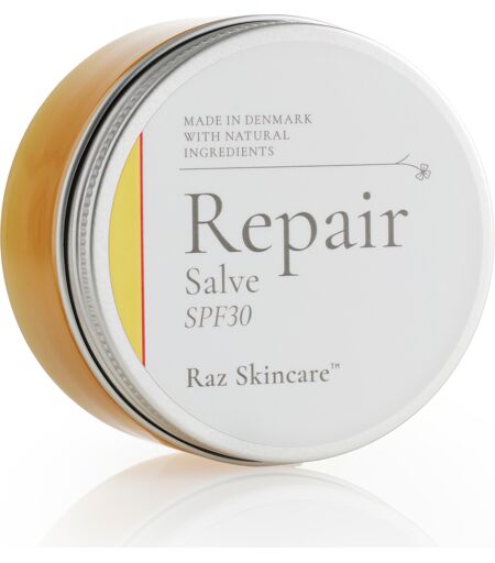 Raz Skincare Repair SPF 30 er en naturlig salve med solbeskyttelse baseret på lanolin, sheasmør og planteolier tilsat solfiltre, der også er sikre at bruge på læberne. Salven kan bruges overalt på kroppen og i ansigtet, men den er særlig velegnet til de områder, som er meget udsatte som fx læber, kinder og næse. Salven er meget velegnet til skiferien, men kan med fordel bruges året rundt. Udover solbeskyttelse lindrer salven alle former for irritationer, sår, eksem, tør/sprukken hud, tørre læber, flossede neglebånd mm. ...