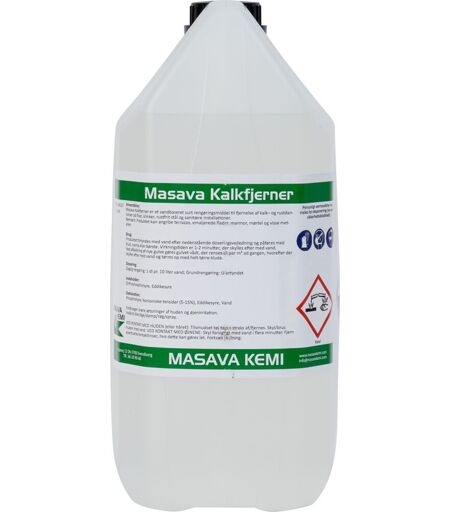Masava Kemi Kalkfjerner – effektiv bekæmpelse af kalkMasava Kalkfjerner er en kraftfuld og effektiv vandbaseret surt grundrengøringsmiddel, som fjerner selv de mest genstridige kalk- og rustbelægninger på fliser, klinker, rustfrit stål og sanitære installationer. Rengøringsmidlet indeholder en unik kombination af non- og kationiske tensider, uorganiske syrer og organiske syrer, som sikrer en nem og effektiv fjernelse af kalk. Kalkfjerneren er et ideelt valg til både industrielle og husholdningsmaskiner, og kan bruges til afkalkning af kaffemaskiner, elkedler, vaskemaskiner, varme- og kuldevekslere og andre apparater, der har behov for afkalkning.Masava Kalkfjerner kan fortyndes med koldt eller varmt vand. Til daglig rengøring anbefales det at blande 1 del kalkfjerner med 10 dele vand. Ved grundrengøring anvendes produktet ufortyndet. Opløsningen påføres med en klud, svamp eller børste. Lad opløsningen eller koncentratet virke i et par minutter, og skyl derefter grundigt med vand.SpecifikationerIndhold: 5 literKalkfjernerFjernelse af kalk og rust på overflader og husholdningsmaskinerpH-værdi koncentreret: 0,5pH, 1-vol-%: 2,2Massefylde: 1,12 g/mlGul væskeBrug altid gummihandskerIndeholder en vandig opløsning af non- og kationiske tensider, uorganiske syrer og organiske syrerBemærk: Produktet kan angribe terrazzo, emaljerede flader, marmor, mørtel og visse metaller ...