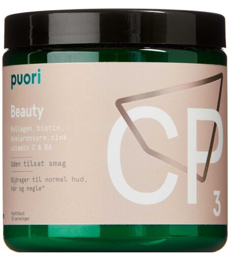 Puori CP3 Beauty Kollagen er kollagen, biotin, hyaluronsyre, zink, vitamin C og B6 uden smag, som bidrager til normal hud, hår og negle. Zink og biotin bidrager til normal dannelse af kollagen, der har betydning for normalt fungerende hud. Zink bidrager til vedligeholdelse af normale negle. Dispenseringsform Pulver ...