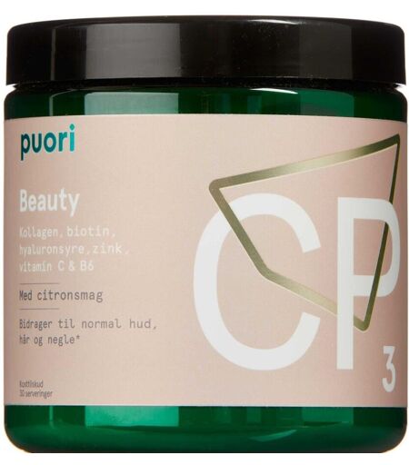 Puori CP3 Beauty Kollagen Citron er kollagen, biotin, hyaluronsyre, zink, vitamin C og B6 med citronsmag, som bidrager til normal hud, hår og negle. Zink og biotin bidrager til normal dannelse af kollagen, der har betydning for normalt fungerende hud. Zink bidrager til vedligeholdelse af normale negle. Dispenseringsform Pulver ...