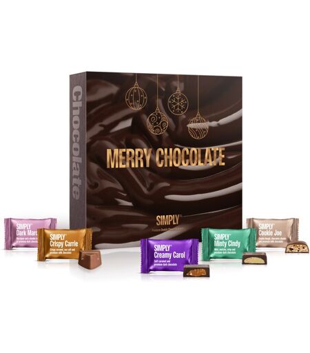 Simply Merry Chocolate Gør julen endnu mere magisk med Simply Christmas Premium Box, en luksuriøs gaveæske fyldt med et bredt udvalg af de bedste chokolade bites, faktisk hele 50 stykker chokolade i 10 forskellige smagsvarianter, lige fra Crispy Carrie til Persian Perry. Denne eksklusive boks er designet til at sprede glæde og forkælelse i den søde juletid. Perfekt til at dele med familie, venner eller kolleger, eller som en velfortjent gave til dig selv. Om Merry Chocolate æsken: Antal: 50 bites Vægt: 500 g 10 forskellige varianter 5 stk. af hver varaint Individuelt indpakket Simply smagen: Crispy Carrie: Knasende karamel, havsalt og mælkechokolade Cookie Joe: Cookie dough, chokolade chunks og mælkechokolade Creamy Carol: Blød karamel og mørk chokolade Minty Cindy: Mint, matcha te, crisp og mørk chokolade Dark Marci: Marcipan og dobbelt lag mørk chokolade Pink Polly: Hindbær, persisk lakrids og hvid chokolade Mocca Molly: Crunchy kaffebønner og mørk chokolade Grainy Sue: Havre, spelt, karamel, peanuts og mørk chokolade Persian Perry: Persisk lakrids og hvid chokolade Grainy Billy: Kokos, tranebær og mælkechokolade Oplagt valg til chokoladeelskere Brug den fine chokoladeæske som en julehilsen til f.eks. dine medarbejdere, kollegaer, samarbejdspartnere, forretningsforbindelser og leverandører. Du kan selvfølgelig også vælge at forære chokoladen til familie og venner - uanset hvem modtageren af den flotte æske er, så kan de nyde julen med lækker chokolade. Simply Chocolate – All Natural – Handmade in Copenhagen Simply Chocolate er en ægte københavnerbaseret virksomhed, som kun bruger det bedste naturen har at byde på, når der skal udvælges ingredienser og råvarer. Smag og kvalitet er altid i højsædet og de bruger meget tid på at finde gode ingredienser og interessante smagsoplevelser, så der aldrig bliver gået på kompromis med hverken den gode smag eller den høje kvalitet. Simply tager et ansvar der når langt ud over Danmarks grænser – hele vejen til Afrika og Elfenbenskysten, hvor kakaoen til vores chokolade vokser. Simply er nemlig en del af Cocoa Horizons, der arbejder for at sikre, at kakaobønderne, deres familier og de lokale samfund omkring kakaomarkerne trives og har mulighed for at forbedre deres liv. ...