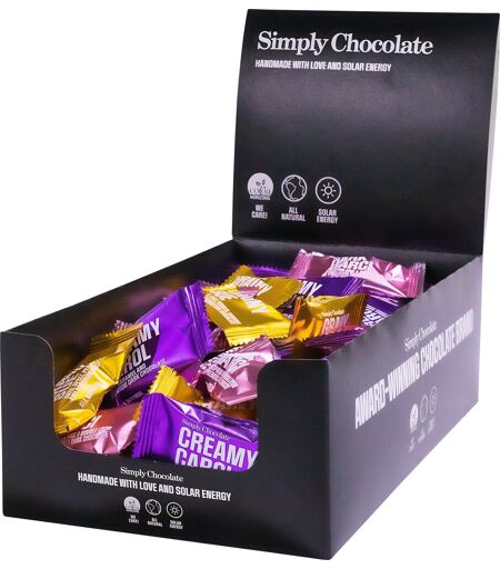 Simply Small Ones Mix af velsmagende små chokoladebarer Du får her en god blanding af små lækre chokoladefristelser i 3 forskellige varianter. Lad dig friste af Grainy Sue, Dark Marci og Creamy Carol. Grainy Sue Grainy Sue er god base af karamel og peanuts overrukket med udsøgt mørk premium chokolade. Den mørke chokoladeskal i kombination med et blødt, let sejt indre giver Sue en førsteplads som en af de mest velsmagende barer. Dark Marci Dark Marci er et dobbelt lag af udsøgt mørk premium chokolade med et center af marcipan lavet på mandler fra Valencia. Et raffineret mix af sødt og let bittert giver den her klassiker lidt ekstra. Creamy Carol Creamy Carol er premium mørk chokolade, med et lækkert center af blød og cremet karamel. For elskere af blød karamel er det ingen bedre end Carol. De små chokoladebarer er gode som kaffeslik og kan med fordel sættes frem på kontoret, i mødelokalet og på kaffebordet. Æske med 75 stk. Vægt pr. stk.: 10g 3 forskellige varianter Simply – All Natural – Handmade in Copenhagen Vi producerer smagfulde håndlavede chokolader her på fabrikken og er meget kræsne, når det kommer til vores ingredienser. Derfor går vi langt uden om laboratorier med pulver og tilsætningsstoffer, som ingen alligevel kan udtale navnene på. Der bruges kun det bedste naturen har til rådighed – smag og kvalitet betyder alt for os. Det kalder vi: ‘All Natural’ Vi lægger så megen sjæl og passion i at producere de mest velsmagende chokoladebites, at hver bite automatisk har fået sit helt eget navn og personlighed. Alle med hver sin karakteristika og unikke smag og ikke mindst lavet på ansvaligt dyrket kakao. For os er de meget mere end bare chokoladebites - de er chokoladebites, som økonomisk bidrager til bedre forhold, sundhed og uddannelse til familier i Elfenbenskysten. Kald det ansvarlighed, næstekærlighed eller noget helt andet - vigtigst er, at vi gør en forskel for andre mennesker og skaber livskvalitet. Det betyder meget for os! Og nåh ja, så laver vi chokolade på solenergi, hvilket jo gør en kæmpe forskel for miljøet og gør en forskel for vores næste generationer. Så når du tager en bid af vores chokolade, kan du gøre det med god samvittighed. ...