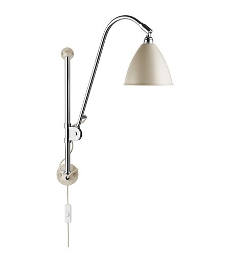 Bestlite BL5 Wall Lamp Ø:16 cm Chrome Base - Soft White Semi Matt skærm Bestlite designet holder sig tæt til dets industrielle rødder og det originale design. Bestlite har permanente kollektioner både på Victoria og Albert Museet og Londons Designmuseum. Bestlite er elsket af både designere, arkitekter og design elskere gennem dens lange historie, som har gjort den til en nutidig klassiker. Design: Robert Dudley Best Mål: Ø: 16 H: 54 - 87 cm Info: Fatning: E14 Watt: Max: 30W - Halogen (lyskilde ikke inkluderet) Ledning: Tekstil ledning som matcher skærmfarven ( dog er krom sort og brass er gylden). Ledningslængde: 2,5 m. Materiale: Krom med pulverlakeret skærm ...