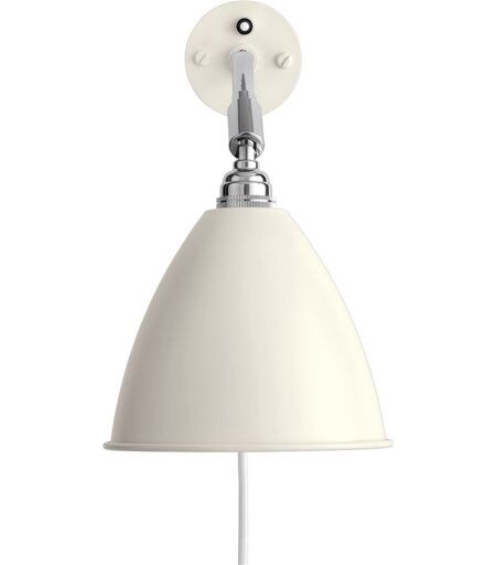 Bestlite BL7 Wall Lamp Ø:16 cm Chrome Base - Matt White skærm Bestlite designet holder sig tæt til dets industrielle rødder og det originale design. Bestlite har permanente kollektioner både på Victoria og Albert Museet og Londons Designmuseum. Bestlite er elsket af både designere, arkitekter og design elskere gennem dens lange historie, som har gjort den til en nutidig klassiker. Design: Robert Dudley Best Mål: Ø: 16 cm H: 27 cm Info: Fatning: E14 Watt: Max: 30W - Halogen (lyskilde ikke inkluderet) Ledning: Tekstil ledning som matcher skærmfarven ( dog er krom sort og brass er gylden). Ledningslængde: 1,6 m. Materiale: Krom med pulverlakeret skærm. ...