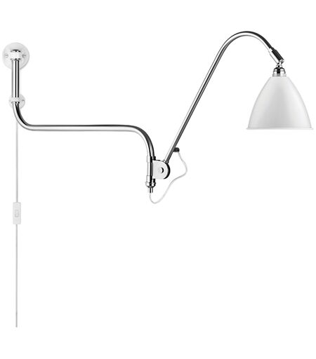Bestlite BL10 Wall Lamp Ø:16 cm Chrome Base - Matt White skærm Bestlite designet holder sig tæt til dets industrielle rødder og det originale design. Bestlite har permanente kollektioner både på Victoria og Albert Museet og Londons Designmuseum. Bestlite er elsket af både designere, arkitekter og design elskere gennem dens lange historie, som har gjort den til en nutidig klassiker. Design: Robert Dudley Best Mål: Ø: 16 H: 54 - 87 cm Info: Fatning: E14 Watt: Max: 30W - Halogen (lyskilde ikke inkluderet) Ledning: Tekstil ledning som matcher skærmfarven ( dog er krom sort og brass er gylden). Ledningslængde: 2 m. Materiale: Krom med pulverlakeret skærm. ...