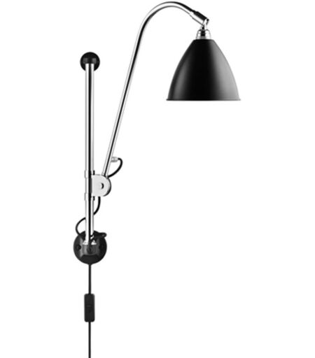 Bestlite BL5 Wall Lamp Ø:16 cm Chrome Base - Black skærm Bestlite designet holder sig tæt til dets industrielle rødder og det originale design. Bestlite har permanente kollektioner både på Victoria og Albert Museet og Londons Designmuseum. Bestlite er elsket af både designere, arkitekter og design elskere gennem dens lange historie, som har gjort den til en nutidig klassiker. Design: Robert Dudley Best Mål: Ø: 16 cm H: 54 - 87 cm Info: Fatning: E14 Watt: Max: 30W - Halogen (lyskilde ikke inkluderet) Ledning: Tekstil ledning som matcher skærmfarven ( dog er krom sort og brass er gylden). Ledningslængde: 2 m. Materiale: Krom med pulverlakeret skærm. ...