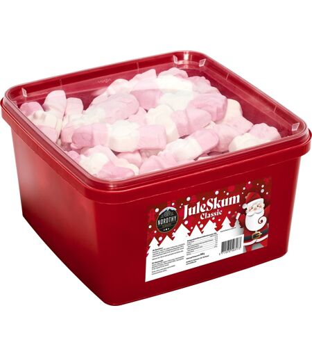 Lyserøde skumjulemænd med jordbærsmag Juleskum er en dansk favorit i juletiden, og har en sikker plads i slikskålen gennem hele december måned. Den elskede juleskum er formet som små lyserøde julemænd med hvidt skæg og har en lækker smag af jordbær og vanilje. De små julemænd er et sikkert hit på julebordet og sikrer med garanti en rigtig god julestemning. Indhold: 800 g Antal: ca. 114 stk. Skum med smag af vanilje og jordbær ...