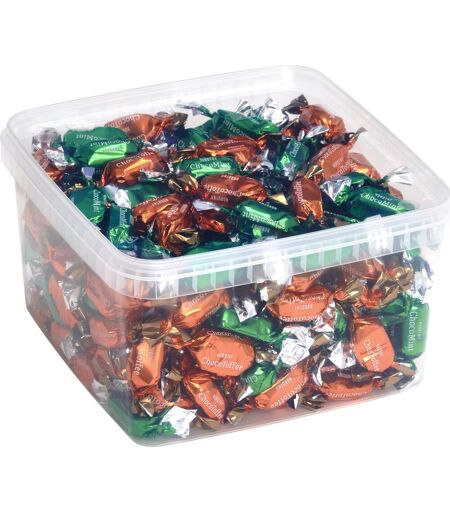Perfekt blanding af chokolade med karamel og mintDu får her en æske med smagfulde små chokoladefristelser i 2 varianter, hvor kan du lade dig friste af et lækkert stykke mørk chokolade med et delikat og frisk fyld af mintcreme eller et velsmagende stykke lys chokolade med et sødt og lækkert karamelfyld. De små chokolader er gode som kaffeslik og kan med fordel sættes frem på kontoret, i mødelokalet og på kaffebordet.Indhold: 965 g Smagsvarianter: Mint og karamel ...