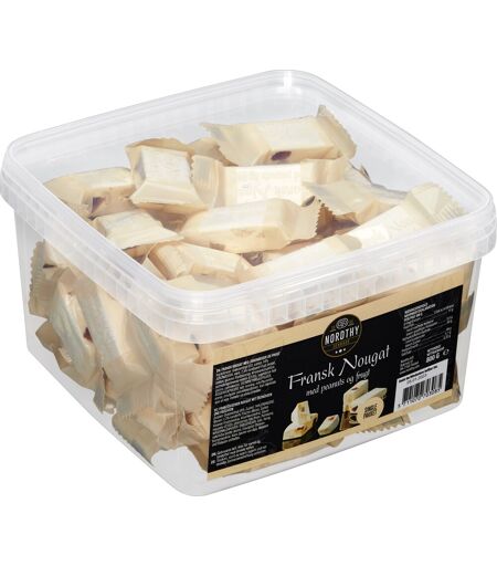 Nordthy Fransk Nougat med peanuts og frugtDu får her en klassisk og lækker fransk nougat fra Nordthy. Du får den velkendte og let seje konsistens med den lækre søde smag af fransk nougat tilsat sprøde peanuts og kandiserede frugtstykker. Den traditionelle franske nougat er yderst lækker smagsoplevelse og er den perfekte lille snack til enhver med en sød tand.Den franske nougat er individuelt indpakket i små mundrette stykker, så de med fordel kan deles bland mange personer og samtidig nemt kan serveres pænt i en skål eller blot kan spises direkte fra bøtten. De små stykker fransk nougat er perfekte som tilbehør til en god kop kaffe eller som en ekstra lille forkælelse på jobbet når der skal holdes møder og konferencer. Indhold: 800 gAntal stykker pr. æske: Ca. 60 stk.Med peanuts og kandiserede frugtstykkerIndividuelt indpakkede ...