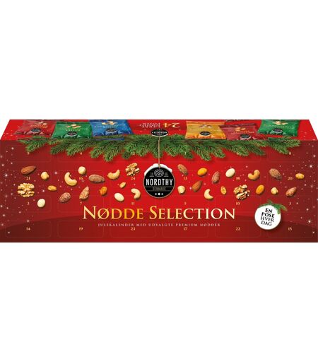 Nordthy Nødde Selection Julekalender Flot julekalender fra Nordthy med lækre nødder. Bag de 24 låger gemmer sig små poser med forskellige nødder. Julekalenderen indeholder 12 forskellige varianter af nødder. Julekalenderen kan med fordel gives til en du holder af eller som en fin julehilsen til dine medarbejdere, kollegaer, samarbejdspartnere, forretningsforbindelser og leverandører. Uanset hvem modtageren af denne julekalender er, kan du være helt sikker på at hyggen spreder sig og skaber masser af god julestemning blandt dine nærmeste. Indhold: 440 g ...