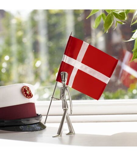 Sæt prikken over i’et ved festlige lejligheder med den Kongelige Fanebærer fra Kay Bojesen – en ikonisk borddekoration, der kombinerer dansk designtradition med legende charme. Figuren er udført i håndpoleret rustfrit stål og bærer Dannebrog i silkelook, som elegant svajer i hånden. Fanebæreren står rank og stolt og bidrager med højtidelighed, humor og national stolthed til enhver fejring. Denne stilrene figur er oplagt som pynt til fødselsdagsbordet, men også en meningsfuld gave til studenter, konfirmander og jubilæer. Inspireret af Kay Bojesens fødeby, København, og hans passion for kongehuset og sølvhåndværk, forener figuren det klassiske og moderne i ét udtryk. Fejr med form og funktion Fanebæreren bringer en festlig og traditionel stemning til både hverdag og højtid. Kombinationen af det skinnende stål og det levende flag skaber en iøjnefaldende kontrast, som tiltaler både børn og voksne. Den er lige dele designobjekt og følelsesladet symbol – skabt til at vække glæde og stolthed. Et ikon i stål – til generationer Med sin solide konstruktion og tidløse æstetik er fanebæreren skabt til at følge med i livets store øjeblikke – igen og igen. Den står smukt fremme og bliver hurtigt en fast del af familiens traditioner. Højde: 18 cm inkl. flag Materiale: Håndpoleret rustfrit stål og stof ...