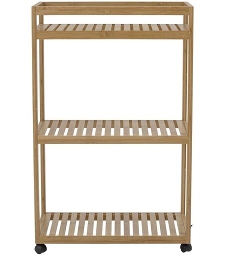 Bloomingville Aden Garderobe Stativ m/Hjul H: 85 cm - Bambus/Natur Aden garderobe stativet fra Bloomingville egner sig rigtig godt som opbevaringsreol på badeværelset eller i soveværelset. Der er god plads mellem hylderne og der kan nemt opbevares håndklæder, sæbe eller andet tilbehør i kurve eller andre opbevaringsløsninger. Stativet er på hjul og kan derfor hurtigt flyttes til et andet sted. Materialet bambus giver et naturligt og afslappet udtryk. Stativet kan benyttes udendørs, dog kun i et overdækket område. Design: Bloomingville Materiale: Bambus Mål: L: 55 cm H 85 cm B: 30 cm Afstand mellem hylder: 30 cm Vægt pr. hylde: 10kg Farve: Natur Rengøring og vedligeholdelse: Rengør med en fugtig klud. ...