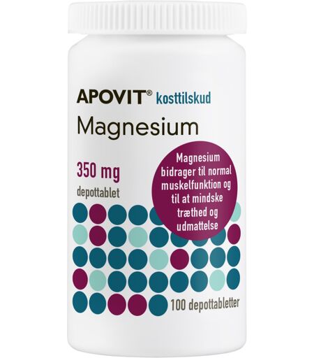Apovit Magnesium 350 mg Depottabletter er et kostilskud. Magnesium bidrager til normal muskelfunktion og til at mindske træthed og udmattelse. Dispenseringsform Depottabletter. ...