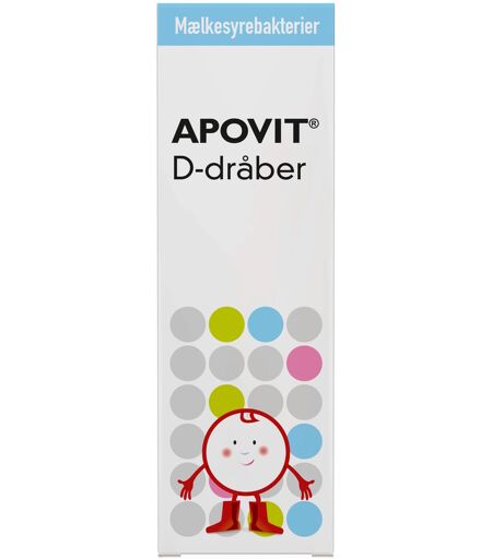 Apovit D-dråber + Mælkesyrebakterier er et kosttilskud med D-vitamin og mælkesyrebakterier fra 3 forskellige mælkesyrebakteriestammer. Vitamin D er nødvendigt for barnets normale vækst og knogleudvikling. Mælkesyrebakterier er en naturlig del af tarmsystemet. Fødevarestyrelsen og Sundhedsstyrelsen anbefaler, at børn fra 2 uger - 4 år får et dagligt tilskud på 10 mikg D-vitamin (som dråber). Hvis barnet får en børnevitamintablet, skal barnet ikke samtidig have D-vitamintilskud. En daglig dosis (5 dråber) ...
