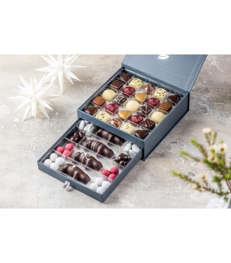 Selection Drawer Box gaveæsken fra Xocolatl er en flot gaveæske fyldt med chokolade, drage og andre lækkerier. I den smukke gaveæske finder du 25 stykker fyldt chokolade med velkendte og klassiske smage som f.eks. saltkaramel, lakrids, marcipan, citron, flødekaramel, appelsin, nougat, kahlua og rom karamel. I den “hemmelige” skuffe finder man 4 marcipangrise overtrukket med 70% mørk chokolade og hånddekoreret med hvid chokolade. Derudover et lækkert dragémix. Smuk gaveæske med ”hemmelig” skuffe De søde og velsmagende julelækkerier kommer i en flot og stilfuld gaveæske i 2 lag – et synligt lag med 25 stykker fyldt chokolade og et lag som kommer frem ved at trække ud i den ”hemmelige” skuffe. I skuffen finder du de lækre marcipangrise med 70% mørk chokoladeovertrak og fine hånddekorerede detaljer i hvid chokolade. Æsken er velegnet som en sød lille julehilsen til både mænd og kvinder. Du kan f.eks. bruge gaveæsken som en ekstra lille julegave når dine venner, kollegaer og samarbejdspartnere skal forkæles lidt ud over det sædvandelige. Specifikationer: Indhold: 435 gram Xocolatl: Håndlavet Dansk Chokolade Xocolatl tilbyder håndlavet chokolade skabt i hjertet af Christiansfeld. Chokoladen produceres under Cocoa Horizons-programmet og fremstilles med 100 % naturlige farver. Xocolatl kombinerer respekt for tradition og håndværk med modet til at eksperimentere med smag, konsistens og farver. Engagementet i miljømæssigt og socialt ansvar afspejles i den omhyggelige udvælgelse af råvarer, hvilket sikrer chokolade af høj kvalitet, der er produceret under Cocoa Horizons. ...