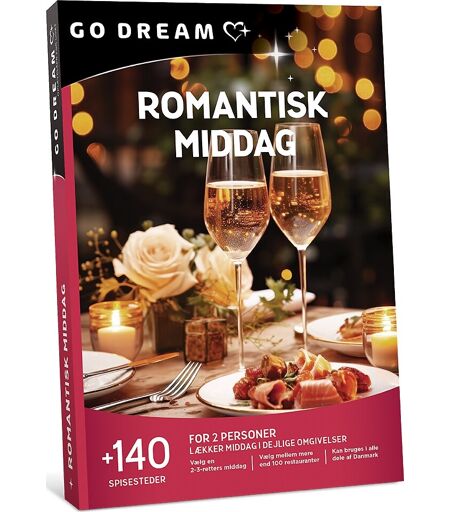 Overrask din mand, kæreste eller kone med et gavekort fra Go Dream til en romantisk middag for 2 – eller giv den til et par, der fortjener at nyde hinanden lidt mere.Skab jer et åndehul i den hektiske hverdag og genfind den første forelskelse i stearinlysenes skær, mens I nyder jeres lækre middag og velskænkede vin. Forvandl det travle liv til kvalitetstid med hinanden. Nu kan I lade romantikken blomstre, når I sætter jer til rette ved et veldækket bord, og lader en hyggelig stemning danne rammen for en romantisk aften i tosomhed.Middagen består af 2-3 retter, afhængig af hvilken café eller restaurant, I vælger, samt 1 glas vin til hver. Vælg selv, hvor I vil spise, blandt en række af gode restauranter, caféer og spisesteder i hele Danmark. Man glemmer ofte, hvor fantastisk en partner man egentlig har. Nu kan I opdage hinanden på ny, og slippe amorinerne løs med en romantisk middag! Gyldighed i 3 år & 3 måneder.Læs mere om oplevelsen og indløsningssteder her: https://www.godream.dk/b/romantisk-middag-for-2 ...