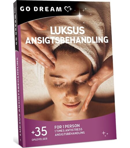 Læn dig tilbage og nyd en helt fantastisk og afstressende luksus ansigtsbehandling med et gavekort fra GO DREAM, der udover øget velvære også fokuserer på at tilføre anti-aging og forebyggelse af ældning af huden.Når du ligger på briksen, vil du snart glemme alt andet end den dejlige ansigtsbehandling – og give dig hen til nydelsen! Du vil være i hænderne på en kyndig kosmetolog, som vil anvende de allerbedste produkter - nøje udvalgt til netop din hudtype. Du vil både kunne se og mærke forskellen. I denne luksuriøse ansigtsbehandling indgår også afspændende ansigtsmassage kombineret med en dejlig hovedbundsmassage. Glæd dig til en behandling, som udover at være effektivt plejende også er en afslappende og forkælende nydelse.Nyd en skøn behandling – og forandring – du vil kunne se og mærke længe efter!Bestil luksusansigtsbehandling til dig selv eller giv behandlingen i gave til din bedste veninde, datter, mor eller kæreste. Gyldighed i 3 år & 3 måneder. Læs mere om oplevelsen og indløsningssteder her: https://www.godream.dk/b/luksus-ansigtsbehandling ...