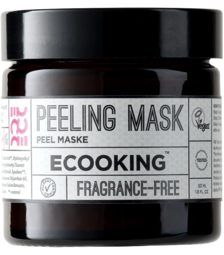 Ecooking Peeling Mask er en peeling maske, som med en effektiv kombination af mælkesyrer og glykolsyre, også kaldet AHA-syrer, peeler huden i dybden ved at fjerne døde hudceller og stimulere hudens naturlige kollagenproduktion. Syrerne arbejder i synergi, så huden udglattes, fine linjer og rynker reduceres, og synligheden af pigmentpletter mindskes. Resultatet er en mere ensartet hudstruktur med et friskt udtryk og en sund, strålende glød. Masken har en pH-værdi på 3,5, hvilket sikrer en aktiv behandling, der kan mærkes – det er helt normalt, hvis huden prikker, stikker eller bliver rød kort efter brug. Netop derfor anbefales det at anvende den om aftenen, så huden får tid til at falde til ro natten over. Peel Masken er dog lige så effektiv, selvom din hud ikke bliver rød. Det er vigtigt at huske, at masken ikke må bruges inden ophold i solen, da huden bliver ekstra følsom efter eksfoliering. Rens altid masken af med lunkent vand og dit favoritrenseprodukt, så huden efterlades frisk, ren og klar til din videre hudplejerutine. Fordele: Peeling maske Peeler huden i dybden Fjerner døde hudceller Stimulerer kollagenproduktionen Udglatter hudens overflade Reducerer fine linjer og rynker Mindsker synligheden af pigmentpletter Giver huden et ensartet og friskt udtryk Efterlader huden med flot glød PH-værdi på 3,5 Kan prikke, stikke og give midlertidig rødme Mest velegnet at bruge om aftenen Må ikke bruges inden ophold i solen Skal altid renses af med lunkent vand og renseprodukt AllergyCertified, vegansk, dermatologisk testet og parfumefri Anvendelse: Du kan bruge Peel Masken 1-3 gange om ugen Start med at lade masken sidde 4–6 minutter alt efter hvilken hudtype du har Trap derefter langsomt op før du lader den sidde 10–12 minutter – og ikke længere end det Trin 1: Rens din hud og smør derefter masken på i et jævnt lag – hold god afstand fra øjne og mund. Når du har påført masken vil du måske mærke at det prikker og stikker i din hud som også kan være rød bagefter. Derfor anbefaler vi at du anvender masken om aftenen. Trin 2: Fjern forsigtigt masken med lunkent vand. Rens din hud grundigt og neutralisér masken med dit foretrukne renseprodukt. Trin 3: Giv til slut din hud god næring med dit favoritserum og natcreme. Du kan også give den et ekstra fugtboost med en fugtgivende maske - evt. Ecookings Fugtmaske som kan få lov til at forkæle din hud natten over Ingrediensliste: Aqua, Lactic Acid (natural), Hydroxyethyl Acrylate/Sodium Acryloyldimethyl Taurate Copolymer, Sodium Hydroxide, Squalane (natural), Glycolic Acid, Gluconolactone, Polysorbate 60, Sodium Dehydroacetate, Sodium Benzoate, Calcium Gluconate ...