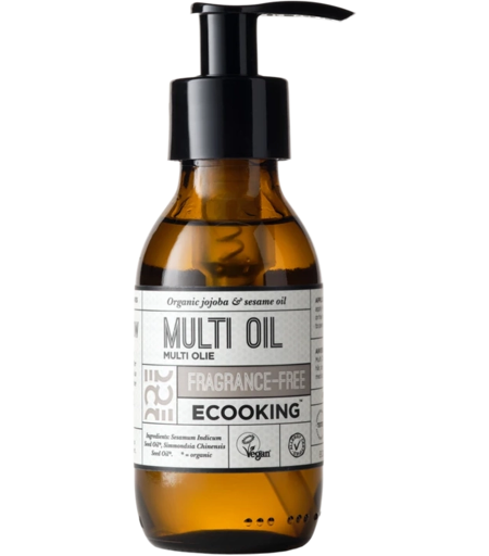 Ecooking Multi Oil Fragrance Free er et multiprodukt, som består af en blanding af unikke, multifunktionelle og økologiske olier. Brug Multi Olie til fx: Kropsolie, som påføres på fugtig hud efter bad Afrensning af huden Makeupfjerner Barbering til både mænd og kvinder Intimbarbering Hårkur Kur mod tør og skællet hovedbund Massageolie Fodbad og karbad Neglebåndspleje Multi Olie indeholder bl.a. økologisk jojobaolie og økologisk sesamolie Fordele: Multiolie Flere anvendelses muligheder Beriget med økologiske olier Vegansk og dermatologisk testet AllergyCertified, parfumefri, vegansk og dermatologisk testet Anvendelse: Påfør altid på fugtig hud, hår eller skæg da vand hjælper olien med at trænge bedre ind. Til hår eller skæg: Put 2-3 dråber i håndfladen og gnid hænderne sammen. Fordel olien i hårlængder og -spidser eller jævnt i skægget. Ved barbering: Fugt huden med lunkent vand og kom olien på det område du ønsker at barbere. Vent et øjeblik og lad olien trænge ind for at blødgøre hårene (1–5 minutter). Barber derefter normalt med en skraber. Herved undgår du indgroede hår skægpest samt tørre og dryssende skinneben. Efter barbering smøres området med en smule olie. Ingrediensliste: Sesamum Indicum Seed Oil, Simmondsia Chinensis Seed Oil ...