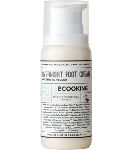 Ecooking Overnight Foot Cream er en helt særlig fodcreme, der effektivt fjerner hård hud, samtidig med at den giver fødderne masser af fugt. Fodcremen har en kølende effekt og en skøn, frisk duft af naturlig eukalyptus. Fodcremen er skabt til at bruge natten over, hvor dine fødder har god tid til at suge de gode råvarer til sig. Kan bruges af alle hudtyper og alle aldre. Denne fodcreme indeholder målrettede ingredienser, bl.a.: Naturlig carbamid (urea), som kan binde væske i huden og modvirke udtørring. Vi har fyldt hele 15% carbamid i fodcremen. Naturlig mælkesyre, der er en af de velkendte AHA-syrer, som har en eksfolierende virkning og effektivt fjerner døde hudceller og hård hud, samtidig med at den stimulerer kollagenproduktionen. Naturlig Eucalyptus Globulus, en æterisk olie, der øger blodcirkulationen, giver en frisk duft og køler huden. Fordele: Fodcreme Effektivt fjerner hård hud Giver fødderne masser af fugt Har kølende effekt Frisk duft af naturlig eukalyptus Beregnet til brug natten over Indeholder målrettede ingredienser, der plejer huden Stimulerer hudens fornyelse og kollagenproduktion Vegansk og dermatologisk testet Anvendelse: Smør dine fødder godt ind hver aften inden sengetid. Giv evt. dine fødder ekstra forkælelse ved at massere fodremen ind Fodcremen skal ikke skylles af men arbejde natten over For en endnu mere effektiv optagelse kan du sove med et par tynde bomuldsstrømper Ingrediensliste: ChatGPT sagde: Aloe Barbadensis Leaf Water, Aqua, Urea, Ricinus Communis Seed Oil, Cucumis Sativus Fruit Water, Cetearyl Alcohol, Glyceryl Stearate Citrate, Rhus Verniciflua Peel Cera/Rhus Succedanea Fruit Cera, Glycerin, Prunus Amygdalus Dulcis Oil, Eucalyptus Globulus Leaf Oil, Menthol, Sesamum Indicum Seed Oil, Sodium PCA, Lactic Acid, Panthenol, Carbomer, Sodium Caproyl/Lauroyl Lactylate, Caprylyl Glycol, Sodium Levulinate, Sodium Hydroxide, Glyceryl Caprylate, Potassium Sorbate, Ascorbyl Palmitate, Tocopherol, Citric Acid, Sodium Benzoate, Pantolactone, Parfum, Limonene, Linalool ...