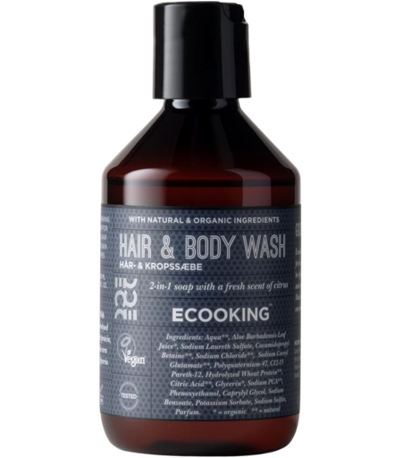 Ecooking Men Hair og Body Wash er en plejende sæbe, der kan bruges til både hår og krop. Sæben er velegnet til alle hår- og hudtyper og har en frisk duft af citrus. Sæben er en to-i-en sæbe, der rengør dit hår og din krop, samtidig med at den plejer og giver ny energi til hud, hår og hovedbund. Ecooking Men Hair og Body Wash indeholder bl.a.: Hydrolyseret hvedeprotein, der giver glans til dit hår og virker beskyttende mod irriteret hud og hovedbund. Økologisk aloe vera, som beroliger og har været brugt i århundreder til at fugte, genopbygge og blødgøre huden. Økologisk glycerin, der fugter og blødgør hår og hud. Fordele: Hår- og kropssæbe til mænd Velegnet til alle hår- og hudtyper Frisk citrusduft Renser og plejer samtidig Giver energi til hud, hår og hovedbund Tilfører glans og beskytter hår og hovedbund Beroliger og fugter huden Blødgør hår og hud Vegansk og dermatologisk testet Anvendelse: Brug sæben i badet til at vaske både hår og krop inden du skyller af med vand Ingrediensliste: Aqua, Aloe Barbadensis Leaf Juice, Sodium Laureth Sulfate, Cocamidopropyl Betaine, Sodium Chloride, Sodium Cocoyl Glutamate, Polyquaternium-47, C12-15 Pareth-12, Hydrolyzed Wheat Protein, Citric Acid, Glycerin, Sodium PCA, Phenoxyethanol, Caprylyl Glycol, Sodium Benzoate, Potassium Sorbate, Sodium Sulfite, Propanediol, Parfum, Geranyl Acetate ...