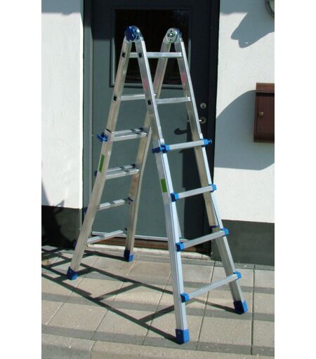 Multikombinationsstige i aluminium Multikombistige med drejelig forbindelse, som både kan anvendes som enkelt- og wienerstige. Stigen justeres i højden - trin for trin og kan dermed indstilles den enkelte opgave. Kan også anvendes på trapper. Når arbejdet er færdigt foldes stiges nemt sammen, og sammenklappet optager stigen minimal plads, og er derfor ideel til den daglige transport. Meget populær hos håndværkere. Specifikationer: Stigelængde, enkeltstige: 4,15 meter Højde, wienerstige: 2,00 meter Transportmål (HxBxD): 130x57x21 cm Antal trin: 4 x 4 trin Trin: 30 x 30 mm Trinafstand: 280 mm Godkendt EN131 - Max. belastning 150 kg. Vægt: 12,50 kg ...