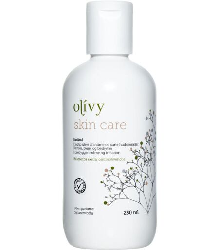 Olívy Skin Care Intim er et 3-i-1 leave on produkt, der både renser, plejer og beskytter huden. Produktet forebygger effektivt rødme og irritation i intime områder herunder ved inkontinens. Produktet bruges dagligt som et skånsomt alternativ til vand, sæbe og barrierecreme. Forebygger også lugtgener. Produktet kan med fordel også bruges til tør, irriteret og kløende hud på hele kroppen herunder til pleje og forebyggelse af røde hudfolder og atopisk hud. Olívy skin care - intim sikrer opretholdelsen af hudens normale pH-værdi, fedtbalance og barrierefunktion. Resultatet er en sund og modstandsdygtig hud. ...
