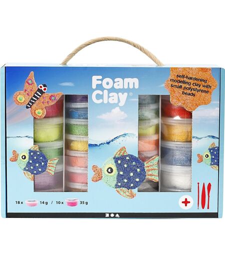 Grov og selvhærdende modellervoks med små perlerMed modellervoks fra Foam Clay får du en grov modelleringsmasse tilsat små polystyrenperler til modellering og kreativ udfoldelse. Den grovkornede konsistens gør voksen nem at arbejde med og gør den særdeles velegnet til dekorativ beklædning af alverdens emner.Foam Clay er en selvhærdende modellervoks med en god hæfteevne, så du let kan beklæde og fastgøre modelleringsmassen på forskellige emner, helt uden brug af lim. Du beklæder nemt emner ved at trille små kugler af modellervoksen, hvorefter du presser dem fast på emnet og fordeler dem jævnt med fingrene. Du kan også rulle Foam Clay ud på f.eks. en plastlomme og lade massen tørre, hvorefter du kan udstanse eller klippe massen i forskellige faconer. Dine udklip kan herefter bruges til kreativ dekoration og fastgøres nemt til et emne med en frisk kugle voks.Modellervoksen leveres i praktiske lufttætte bøtter, til opbevaring af voksen. Låget skal holdes lukket når voksen opbevares så du undgår uønsket tørring og hærdning. I gaveæsken finder du 10x35 g + 18x14 g Foam Clay modellervoks i forskellige farver, samt 3 forskellige modelletingsværktøjer, så du nemt kan slippe fantasien og kreativiteten løs. ...