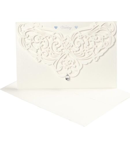 Eksklusive bryllupskort og kuverterFlotte og stilfulde bryllupskort fra Happy Moments. Du får her eksklusive dobbeltkort med fine og elegante udskæringer og ordet ”Wedding” påtrykt i sølv mellem to små hjerter øverst på kortet. Kortene har en flot og stilfuld perlemorsoverflade og et løst indlæg af kraftigt hvidt papir. Med kortene medfølger små rhinsten som du kan bruge til at dekorere og pynte med, så dine bryllupsinvitationer får et yderst elegant og stilfuldt udtryk når der skal inviteres gæster til den store dag.Til kortene medfølger matchende kuverter, også med flot perlemorseffekt, så dine invitationer og indbydelser udstråler elegance fra yderst til inderst, når de sendes afsted.Farve: RåhvidPakke med 5 sæt (kort + kuvert)Kortstørrelse (HxB): 12 x 17,7 cmKuvertstørrelse (HxB): 12,5 x 18 cm ...