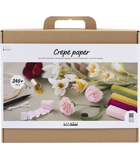DIY Kit til fremstilling af blomster i crepepapir Vil du lære at lave blomster af crepepapir? Så er dette maxi DIY kit det perfekte valg. Med dette kit kan du nemlig lave en masse forskellige blomster i crepepapir, da sættet indeholder alle de materialer, skabeloner og vejledninger du skal bruge for at lave en lang række af forskellige og smukke crepepapirblomster. Sættet indeholder: Crepepapir i forskellige farver Blomsterstængler Støvdragere Akvareltusser Vandforstøver Glitter Bonzaitråd Kugler Lim Falseben Lav mange forskellige og smukke crepepapirblomster Med dette kreative maxikit kan du nemt lave i massevis af forskellige crepeblomster og blade. I kittet får du skabeloner til ni forskellige blomster og blade – ligesom du også får akvareltusser, vandforstøver og glitter, så du selv kan farvelægge og dekorere både kronblade og støvdragere og give dine blomster en masse fine detaljer. Al den nødvendige vejledning medfølger, men du kan også frit bruge materialerne til at lege med dine egne blomsterdesigns. Scan sættets QR-kode og bliv ført ind i et spændene læringsunivers. Her finder du videoer, som trygt guider dig til fremstilling af flere typer af papirblomster gennem forskellige teknikker. Til sidst står du med en smuk buket af crepepapirsblomster. ...