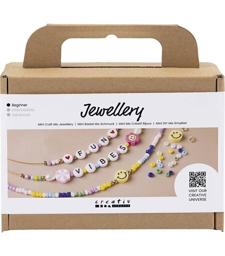 Mini DIY Kit til fremstilling af perlehalskæder Vil du lave dine egne kreative halskæder og opleve magien ved at bære dine egne smykkedesigns? Så er dette DIY minikit det perfekte valg. Med sættet kan du nemlig lave dine egne farverige halskæder med fine rocaiperler, motivperler og bogstavperler. Sættet indeholder alle de materialer du skal bruge, og al den vejledning og inspiration du behøver, for at komme godt i gang. Sættet indeholder: Rocaiperler Motivperler Bogstavperler Ferskvandsperler Wire Wireklemmer Knudeskjulere Karabinhager Lær at lave dine egne kreative perlehalskæder i flotte, friske farver Dette perlemix giver dig et sjovt, lille smykkeprojekt, der er nemt at gå til. Sættet indeholder et håndplukket og farvestrålende udvalg af perler, bogstaver og figurperler – og hvis du vil, kan du kombinere dem, så du får et unikt udtryk, der passer til dig. Brug de færdige perlesmykker året rundt – både til hverdag og fest – og når outfittet mangler et frisk pift. Eller giv det som en sød gave, til en du holder af. ...