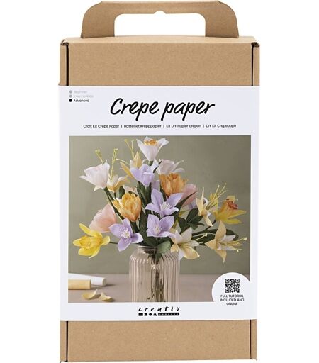 DIY Kit til fremstilling af forårsblomsterbuket i crepepapir Vil du lære at lave blomster af crepepapir? Så er dette DIY kit det perfekte valg. Med dette kit kan du nemlig lave din egen forårsbuket af crepepapir, da sættet indeholder alle de materialer, skabeloner og vejledninger du skal bruge for at lave en smuk buket af forskellige forårsblomster i crepepapir. Sættet indeholder: Crepepapir i forskellige farver Akvareltus Blomsterstængler Støvdragere Pensel Lim Falseben Lav en smuk forårsbuket i crepepapirblomster Med dette kreative kit kan du nemt lave din egen evighedsbuket af crepepapir. I kittet får du skabeloner til fem forskellige crepepapir forårsblomster – ligesom du også får en akvareltus og vandforstøver, så du selv kan farvelægge kronblade og støvdragere. Scan sættets QR-kode og bliv ført ind i et spændene læringsunivers. Her finder du videoer, som trygt guider dig til fremstilling af flere typer af papirblomster gennem forskellige teknikker. Til sidst står du med en smuk buket af crepepapirsblomster. ...