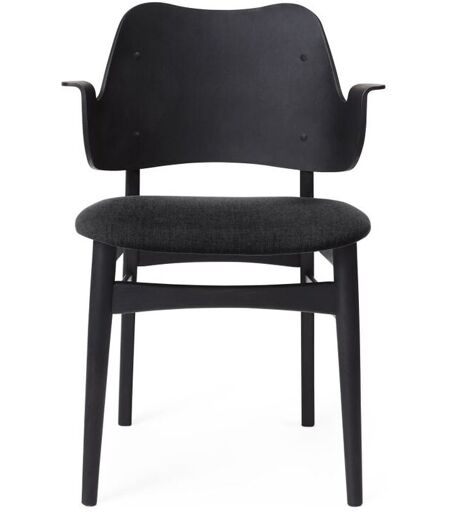 Warm Nordic Gesture Chair - Beech/Anthracite Smuk spisebordsstol fra danske Warm Nordic. Med sit imødekommende og smukke design skaber denne stol en god stemning omkring spisebordet eller ved skrivebordet. De smukke armlæn inviterer dig til at sætte dig ned og finde ro i det formspændte design, og er samtidig designet således at stolen kan rykkes helt tæt på bordet. Denne yderst charmerende spisebordsstol vil passe skønt ind i rum såsom stuen, på kontoret og soveværelset, hvor den vil tilføje en yndefuld detalje til din indretning. OBS. Miljøbillederne viser ikke stolens farve, men dens form samt mulige anvendelse i indretningen. Design: Hans Olsen (1957) Materialer: Stel: Sortlakeret massiv bøg Polstring: Vidar 182 (Kvadrat) Martindale: 100.000 Mål: H: 80 cm B: 54 cm D: 58 cm Siddehøjde: 46 cm Farve: Sort & grå ...