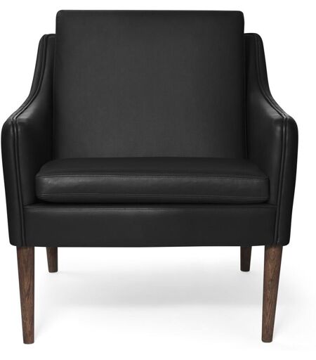 Warm Nordic Mr. Olsen Lounge Chair - Smoked Oak/Black Den luksuriøse lænestol fra Warm Nordic, er designet af den ansete danske arkitekt Hans Olsen. Designet Mr. Olsen som kommer af designerens navn er et originalt design, som vil passe ind i det maskuline herreværelse såvel i den feminine sofakrog. Lænestolen er designet i 50'erne hvor den klassiske møbelkunst gjorde forskellen. Mr. Olsen er slank og organisk i sit udtryk og modsat mange andre af periodens klassikere, bidrager Mr. Olsen med en usædvanlig lethed. De bløde former går fint i spænd med de tilspidsede ben og stolen polstring fås i et hav af smukke tekstiler. OBS. Miljøbillederne viser ikke stolens farve, men viser derimod dens form og mulige anvendelse i indretningen. Design: Hans Olsen, 1956 Materialer: Ben: Røget massiv eg Polstring: Challenger 004 (Nevotex) Semi anilin læder Mål: H: 78 cm B: 81 cm D: 79 cm Sædehøjde: 46 cm Farve: Sort ...