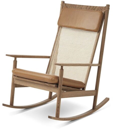 Warm Nordic Swing Rocking Chair H: 103 cm - Teak/Camel Smuk og tidløs gyngestol fra danske Warm Nordic. Hans Olsen, som er designeren på denne skønne stol, har skabt et enkelt og raffineret design, som vil kunne passe ind i ethvert hjem indrettet med forkærlighed til former og naturmaterialer. Stolens ryg er håndflettet i sjene i et simpelt og luftigt mønster, som kombineret med træstellet giver et let og fint udtryk. Gyngestolen er både smuk, æstetisk og komfortabel, og kredser om sig med sine detaljer. Ikke nok med det, så er en også behagelig at sidde i, også længere tid ad gangen. Design: Hans Olsen (1956) Materialer: Stel: Teakolieret massiv eg Polstring: Silk 0250 Anilin læder Mål: B: 68 cm D: 91 cm H: 103 cm Farve: Camel ...