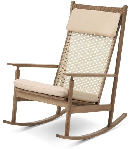 Warm Nordic Swing Rocking Chair H: 103 cm - Teak/Nature Smuk og tidløs gyngestol fra danske Warm Nordic. Hans Olsen, som er designeren på denne skønne stol, har skabt et enkelt og raffineret design, som vil kunne passe ind i ethvert hjem indrettet med forkærlighed til former og naturmaterialer. Stolens ryg er håndflettet i sjene i et simpelt og luftigt mønster, som kombineret med træstellet giver et let og fint udtryk. Gyngestolen er både smuk, æstetisk og komfortabel, og kredser om sig med sine detaljer. Ikke nok med det, så er en også behagelig at sidde i, også længere tid ad gangen. OBS. Miljøbillederne viser ikke stolens farve, men viser derimod dens form og mulige anvendelse i indretningen. Design: Hans Olsen (1956) Materialer: Stel: Teakolieret massiv eg Polstring: Vegetal 090 Anilin læder Mål: B: 68 cm D: 91 cm H: 103 cm Farve: Natur ...