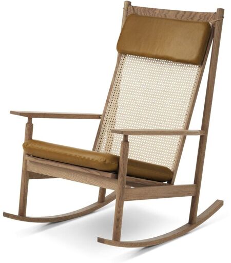 Warm Nordic Swing Rocking Chair H: 103 cm - Teak/Cognac Smuk og tidløs gyngestol fra danske Warm Nordic. Hans Olsen, som er designeren på denne skønne stol, har skabt et enkelt og raffineret design, som vil kunne passe ind i ethvert hjem indrettet med forkærlighed til former og naturmaterialer. Stolens ryg er håndflettet i sjene i et simpelt og luftigt mønster, som kombineret med træstellet giver et let og fint udtryk. Gyngestolen er både smuk, æstetisk og komfortabel, og kredser om sig med sine detaljer. Ikke nok med det, så er en også behagelig at sidde i, også længere tid ad gangen. OBS. Miljøbillederne viser ikke stolens farve, men viser derimod dens form og mulige anvendelse i indretningen. Design: Hans Olsen (1956) Materialer: Stel: Teakolieret massiv eg Polstring: Nevada 2488 Anilin læder Mål: B: 68 cm D: 91 cm H: 103 cm Farve: Cognac ...