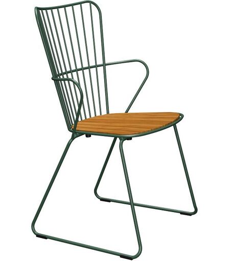 HOUE Paon Dining Chair - Pine Green Smuk havestol fra HOUE. Stolen er designet af danske Henrik Pedersen og er fremstillet i pulverlakeret metal og bambuslameller. Paon har et let og skandinavisk udtryk, dog med et strejf af fransk romantik.Af en metalstol at være, så har Paon en utrolig siddekomfort, som man ikke forventer. Den afrundede ryg er nemlig med til at omfavne dig med tryghed og komfort, der resulterer i total afslapning på terrassen. Serien Paon fra HOUE består også af en loungestol, bænk og barstol så du kan gennemføre stilen på terrassen. Tip: Paon stolene kan stables Design Henrik Pedersen Materiale Stel: Pulverlakeret metal - Hvid Sæde: Bambus lameller Mål Højde: 90 cm Dybde: 54 cm Bredde: 55 cm Sædehøjde: 46 cm Vedligeholdelse: Bambusmøbler kan du have i mange år, så længe at du vedligeholder dem korrekt. Bambus er et naturprodukt og skal derfor også behandles derefter. Det er vigtigt, at bambus får olie et par gange om året. Minimum 2 gange. ...