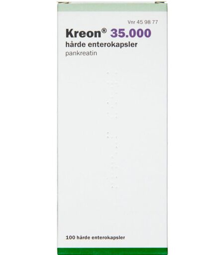 Kreon anvendes ved sygdomme i bugspytkirtlen hvor det efter indtagelse vil virke ved at spalte fedt, protein og kulhydrater til mindre dele, som kroppen kan optage. Kreon 35.000 ...