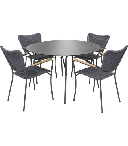 Dansk design klassiker i holdbare materialer Dette sæt består af et Pure cafebord Ø120 cm og 4 Marguerit String havestole. Sættet er perfekt til det lille selskab, der ønsker at nyde det danske sommervejr, hvad enten det er ved caféen eller i haven. Bordet er med bordplade i det velkendte kompaktlaminat, der er både formstabilt og modstandsdygtigt overfor vejr og vind. Bordet er designet med udgangspunkt i den populære Marguerit-serie, så bordets understel har samme look - men teaktræet er skiftet ud med et helt vedligeholdelsesfrit materiale til bordpladen. Lamellernes design er lavet, så vand nemt kan tørres af. Vi ønskede at skabe et bord, der kunne anvendes hele året i de små uderum. Havebordet er ideelt for dem, der ikke har mulighed for at stille det væk for vinteren i et kælderrum eller under halvtag. Marguerit String havestolene har bibeholdt det velkendte design fra Marguerit havestolen, men er fremstillet af snoet reb materiale, der har fået en overfladebehandling så det kan modstå det omskiftelige vejr i Danmark. Pure Cafebord: Farve: Antracit Dimensioner (ØxH): 120 x 71/68,5 cm Marguerit String havestol: Farve: Antracit Dimensioner (BxDxH): 60 x 40,5 x 83 cm Stabelbar Bordet leveres usamlet, til denne medfølger samlevejledning. Stole leveres samlet. Bemærk, at Lomax anbefaler, at havemøbler opbevares indendørs udenfor sæsonen. ...