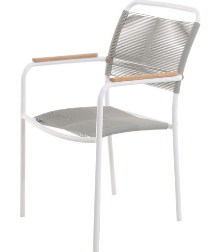 Verona stabelbar havestol med klassisk snoredesign Stolen er i pulverlakeret aluminium, teaktræ og SunLoom fibersnor - et blødt og slidstærkt materiale, der holder både formen og farven. Havestolen er produceret med den eksklusive og vedligeholdelsesfrie SunLoom fibersnor med en UV-behandlet overflade og en kærne af 500 polyestertråde. Det giver et slidstærk, men samtidig blødt flet som hverken falmer, knækker eller bliver slap- og så kan den stables. For at beskytte teaktræet og forlænge det holdbarhed, anbefaler vi, at du behandler dem inden de tages i brug første gang. Møbler med teak vil altid patinere over tid og få en næsten sølvgrå overflade. Produktet er produceret af FLEGT-certificeret træ – lovlig skovdrift. Farve: Hvid, lysgrå Materiale: Aluminium, sunloom fibersnor, teak Dimensioner (HxBxD): 86,5/43 x 53,5 x 45 cm Stabelbar Denne vare leveres samlet. Bemærk, at Lomax anbefaler, at havemøbler opbevares indendørs udenfor sæsonen. ...