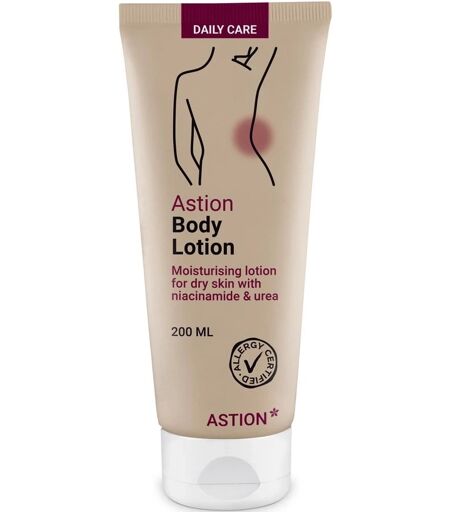 Astion Pharma Body Lotion er en let og hurtigabsorberende bodylotion til daglig pleje af tør og sensitiv hud. Denne lotion er beriget med Urea og Niacinamid (Vitamin B3), der tilsammen sikrer intens fugt og styrker hudens modstandskraft. Den er formuleret til at trænge dybt ind i huden, for at holde din hud hydreret og beskyttet hele dagen. Astion Pharma Body Lotion er særligt effektiv mod kløende og tør hud, og ideel til daglig pleje ved eksem. Den er velegnet til alle hudtyper og kan anvendes af både voksne og børn fra 0 år, hvilket gør den til et familievenligt produkt. Denne lotion er mere end en fugtighedscreme; den arbejder aktivt for at genopbygge og bevare hudens naturlige barriere, hvilket er essentielt i kampen mod eksem og tør hud. Urea reducerer vandtab og forbedrer hudens struktur, mens Niacinamid beroliger og mindsker rødme og irritation. Denne bodylotion er AllergyCertified og uden parfume, hvilket gør den ideel for sensitiv hud eller dem, der foretrækker duftfri produkter. Fordele: Bodylotion Til tør og sensitiv hud Intensivt fugtgivende Holder huden fugtet og beskyttet hele dagen Genopbygger og bevarer hudbarrieren Modvirker fugttab Forbedrer hudens struktur Beroliger og mindsker rødme og irritation Velegnet til alle hudtyper hos voksne og børn fra 0 år Særlig god til kløende hud og daglig pleje af eksem AllergyCertified Parfumefri Anvendelse: Kan anvendes på hele kroppen Bruges 1-2 gange dagligt Hvis huden føles meget tør og stram, kan det være nødvendigt at supplere med en fedtcreme f.eks. Astion Daily Repair 70% Ingrediensliste: Aqua/Water, Helianthus Annuus Hybrid Oil, Butyrospermum Parkii (Shea) Butter, Urea, Glycerin, Glyceryl Stearate Citrate, Cetearyl Alcohol, Niacinamide, Hydrogenated Ethylhexyl Olivate, Phenoxyethanol, Sodium Citrate, Hydrogenated Olive Oil Unsaponifiables, Carbomer, Allantoin, Saccharide Isomerate, Sodium Hydroxide, Caprylyl Glycol, Tocopherol, Citric Acid. ...