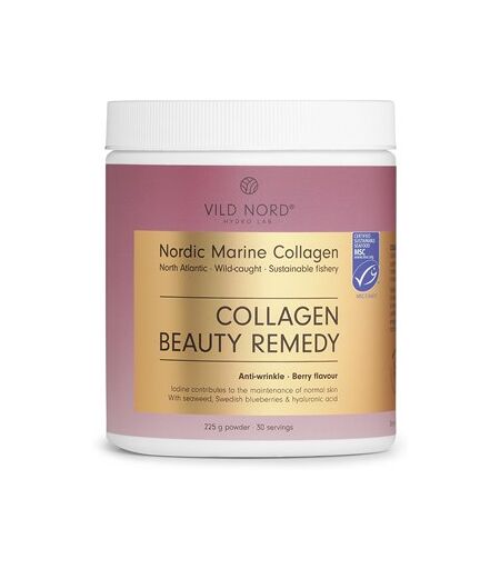 Få smuk hud hele livet med COLLAGEN BEAUTY REMEDY. Oplev effekten af intensiv hudpleje med marint collagen, hyaluronsyre, jod og vitamin C i ét og samme produkt. • Collagen mindsker synligheden rynker og fine linjer • Hyaluronsyre for beauty entusiasten • Jod bidrager til at vedligeholde en normal hud • Antioxidanter fra bær Dybdegående pleje af din naturlige skønhed Et sandt anti-wrinkle kosttilskud, der øger din huds naturlige skønhed. Kroppens naturlige indhold af collagen og hyaluronsyre falder med alderen, hvilket resulterer i rynker og linjer i huden. Collagen Beauty Remedy er en smagfuld og enkel genvej til både collagen og hyaluronsyre. MSC - vores løfte til dig & havet Hos Vild Nord forener vi nordens bedste råvarer i unikke inner beauty produkter. Basen i alt vores collagen er MSC-certificeret, vildtfanget nordatlantisk torsk. At vores collagen er MSC-certificeret betyder, at torsken fanges uden at det påvirker fiskebestanden eller havet den lever i. Det gør det også muligt at spore det enkelte produkt helt tilbage til fangststed og tidspunkt. Ved at vælge MSC støtter du bæredygtigt fiskeri. Alt vores collagen er tredjepartstestet for PFAS og tungmetaller. Det er naturligt for os, og vigtigt for dig. Nyt design - samme høje kvalitet Har du set, at vores produkter har fået nyt design og mindre emballage? Selvom vores produkter har fået nyt design, er det de samme gode og effektive produkter, du kender fra tidligere. Den største og mest synlige forskel er, at vores nye produkter består af 30 % mindre plastik. Derfor vil du heller ikke længere skulle grave efter en måleske i vores produkter. Du har nemlig helt sikkert allerede en brugbar ske i dit køkken - med dit valg gør vi en forskel. Dosis og Anvendelse Anbefales voksne: 7,5 g (2 spiseskeer) Collagen Beauty Remedy indtages i 200-300 ml valgfri væske dagligt. Pulveret har en let smag af bær og er rigtig lækker at bruge i alt fra vand til smoothies og skyr. ...