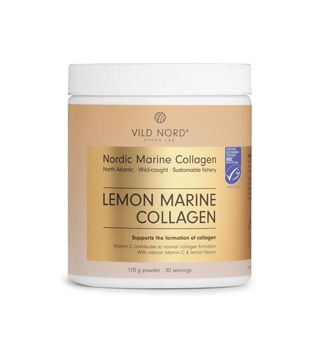Med LEMON MARINE COLLAGEN kan du nyde en frisk smag af citron, mens du får dit daglige tilskud collagen af højeste kvalitet. De hydrolyserede collagenpeptider har et højt indhold af protein, som passer godt til dig, der dyrker en sund livsstil og gerne vil holde dig aktiv hele livet. • God smag og let at opløse i vand • Protein bidrager til at vedligeholde normale knogler og muskelmasse • Vitamin C bidrager til dannelsen af collagen, som har betydning for hud, knogler og brusk Collagen og vitamin C Er du ikke til den naturlige smag af marint collagen, så er Lemon Marine Collagen med garanti noget for dig. Med Lemon Marine Collagen får du vores gode collagen kvalitet, kombineret med naturlige smagsstoffer og vitamin C fra bær. MSC - vores løfte til dig & havet Hos Vild Nord forener vi nordens bedste råvarer i unikke inner beauty produkter. Basen i alt vores collagen er MSC-certificeret, vildtfanget nordatlantisk torsk. At vores collagen er MSC-certificeret betyder, at torsken fanges uden at det påvirker fiskebestanden eller havet den lever i. Det gør det også muligt at spore det enkelte produkt helt tilbage til fangststed og tidspunkt. Ved at vælge MSC støtter du bæredygtigt fiskeri. Alt vores collagen er tredjepartstestet for PFAS og tungmetaller. Det er naturligt for os, men vigtigt for dig. Nyt design - samme høje kvalitet Har du set, at vores produkter har fået nyt design og mindre emballage? Selvom vores produkter har fået nyt design, er det de samme gode og effektive produkter, du kender fra tidligere. Den største og mest synlige forskel er, at vores nye produkter består af 30 % mindre plastik. Derfor vil du heller ikke længere skulle grave efter en måleske i vores produkter. Du har nemlig helt sikkert allerede en brugbar ske i dit køkken - med dit valg gør vi en forskel. Dosis og Anvendelse Anbefales voksne: 5,7 g (1 toppet spiseske) Lemon Marine Collagen indtages i 200-300 ml valgfri væske dagligt. Opløses let med en frisk smag i et glas koldt vand men kan også bruges i yoghurt eller smoothies. ...