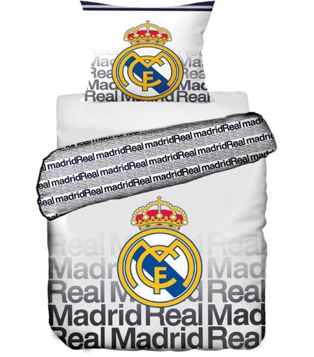 Licens Real Madrid sengetøj - Hvidt vendbart sengesæt med logo og tekst - 140x200 cm - 100% bomulds sengelinned - Fodbold sengetøj