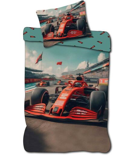 Licens Børne sengetøj 140x200 cm - Vendbart sengesæt med racerbiler - Motiv af rød formel 1 bil - 100% blødt bomulds sengelinned
