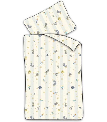 By Mats Baby sengetøj 70x100 cm - Hvidt stribet sengesæt med dinosaurer og rumraketter - 100% blødt bomulds sengelinned