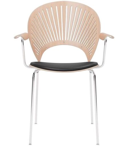 Fredericia Furniture 3397 Trinidad Armstol Sædepolstret - Lakeret Eg/Krom/Sort Primo Læder Skøn og ikonisk stol fra Fredericia Furniture, designet af Nanna Ditzel. Trinidad stolen er unik i sit udtryk og har en skulpturel iøjnefaldende skulpturel karakter. Den gennembrudte finér gør, at Trinidad stolen nærmest opløses i et spil af lys og skygge. Stolens enkelthed udstråler designeren Nanna Ditzels tilgang til design - et let møbel med en vis grad af gennemsigtighed, som samtidig er et møbel der vækker opmærksomhed og som ikke mindst fremstår som et dekorativt element. Trinidad stolen blev lanceret i år 1993 og kunne grundet en helt ny CNC-fræserteknologi blive et designgennembrud - et helt unikt design, som i dag har opnået status som en moderne klassiker. Design: Nanna Ditzel, 1993 Mål: B: 48,5 cm D: 57 cm H: 85 cm Sædehøjde: 46,5 cm Materiale: Træstol med stel i stålrør. Ryg og sæde i formspændt krydsfinér med CNC-fræsende riller. Leveres med udskiftelige plastikglidere. Sædepolstring: Læder Primo 88 - Sort ...