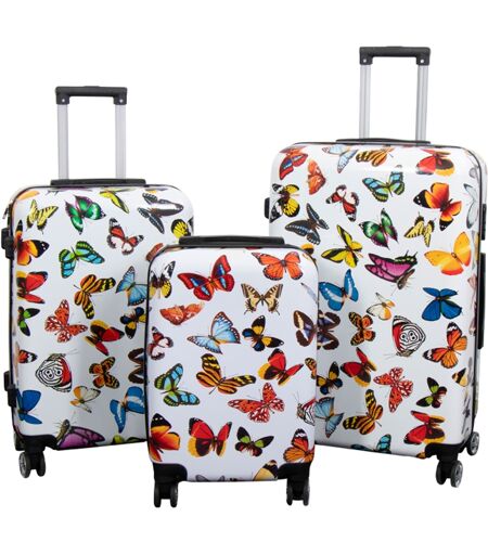Borg Living Kuffertsæt - 3 Stk. - Kuffert med motiv - Hvid med sommerfugle print - Hardcase letvægt kuffert med 4 hjul